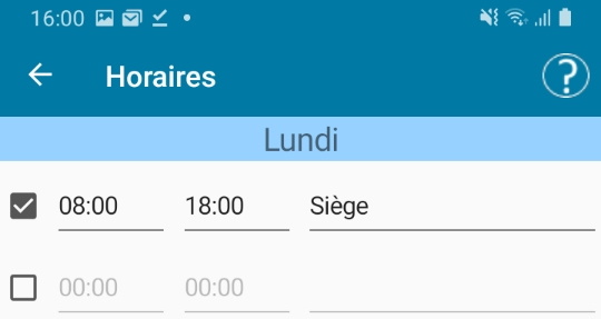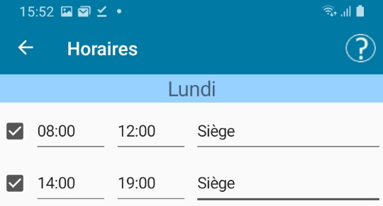 Les horaires sont définis par tranche de 15 mn. sur 24H. Pour indiquer un horaire après midi, séléctionnez des valeurs de 12H à 24H.